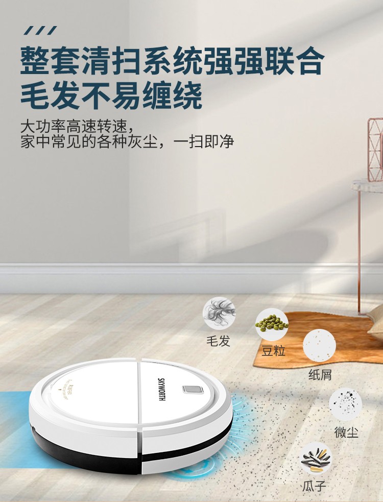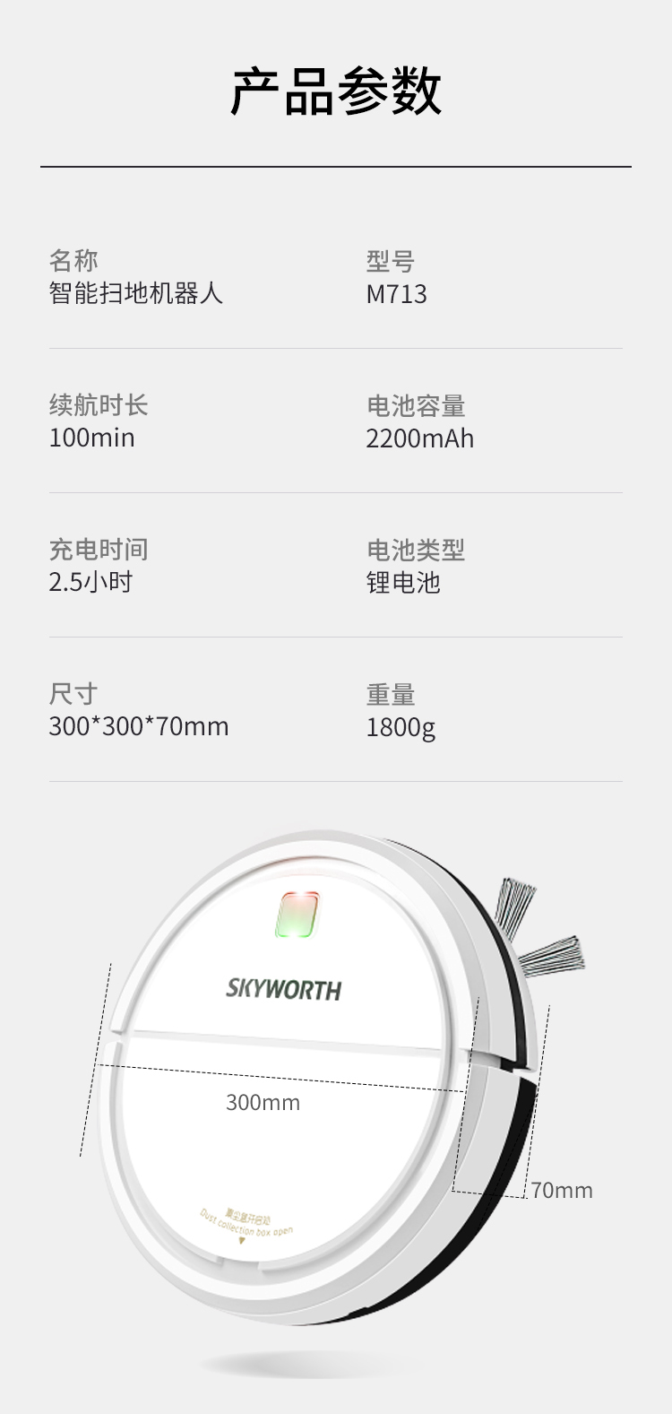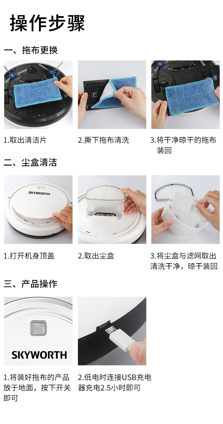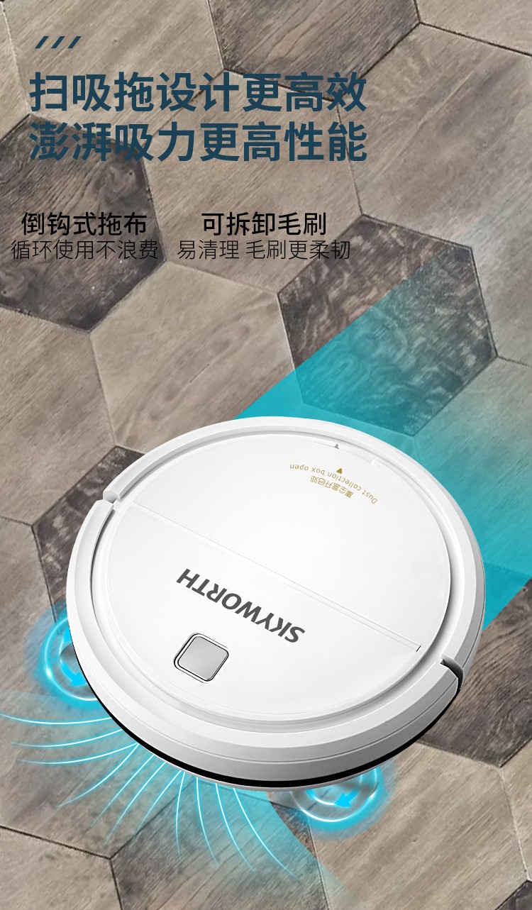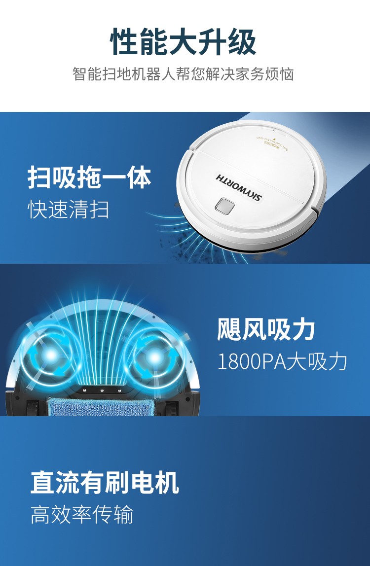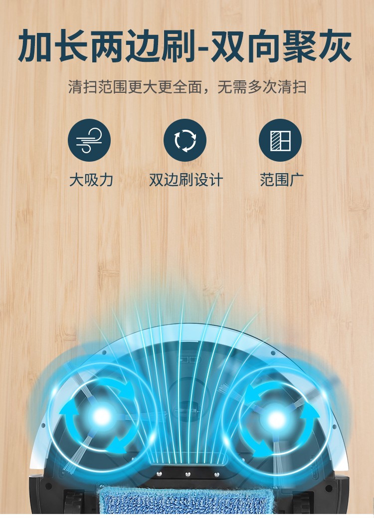 產品參數∶ 充電時間∶4-6小時 產品尺寸∶300mm*300mm*70mm 工作時間∶100-120min 商品內容∶掃地機、USB、說明書、刷子、抹布、魔術貼 適用范圍∶木地板、地磚、大理石等
